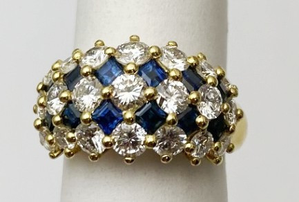 Loading... Please wait...Estate 18kt yellow gold sapphire and diamond checkerboard ring. Four rows alternating round brilliant cut diamonds 2.40 carats and square cut royal blue sapphires 1.90 carats. 9 grams. Size 6. Stamped 18k. 12.60mm wide on top tapers to 3.50mm.