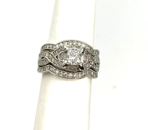 Loading... Please wait...This beautiful set features a .70 carat princess cut diamond prong set in a twisted double row of 40 miligrain set round brilliant cut diamonds. The diamond has an EGL certificate #EGL320122190 with a color and clarity grade of D/VS2. The ring is set in 14kt white gold with two matching curved bands that frame beautifully on either side.