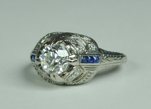 Loading... Please wait...All original period ring from the 1920’s with a .90 carat old European cut center diamond. This center stone has an approximate GIA color and clarity grade of, “I/VS2”. The mounting captivates the period with 6 French cut blue sapphires highlighting the center stone. The mounting has twenty diamonds bead set throughout highlighting the fine piercing work that was perfected during this period. The shank is engraved three quarters of the way down with beautiful hand done work. The shank is stamped, “PLATINUM” and the entire ring tests as such. The ring weighs 4.1 grams and 2.65 dwt. and is currently a size 5.5 and can easily be sized.