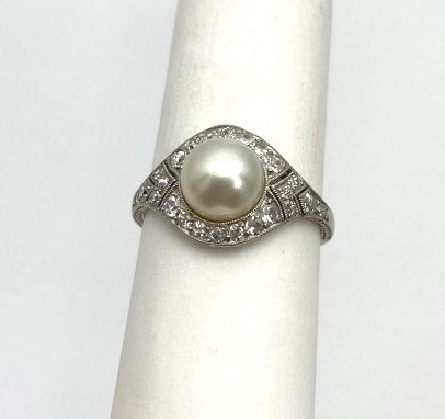 Loading... Please wait...This is a gorgeous diamond and pearl ring from the Edwardian period. Crafted in platinum and, this ring displays a creamy 7mm natural pearl that displays a lustrous white hue. Lacy filigree cutouts and fine miligrain detail surround the natural pearl centerpiece, which is set in a handmade miligrained basket. Delicate rose cut diamonds are bead set within the lacy miligrain work and continue down the shoulders creating a sparkling surface. The diamonds range in size from .02-.05 carats and weigh approximately .80ctw. An airline cutout and delicate beadwork is visible from the side of the ring. A smooth platinum band completes this stunning Edwardian design. It's a lovely and feminine piece and would be a perfect addition to any collection. The ring is currently a size 6 and weighs 2.1dwt.