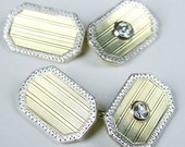 Men’s platinum and 14kt double sided striped cuff links with one bezel set .10 carat diamond in each. These linear cuff links are two-tone on the top and yellow on the back. They are surrounded by a unique platinum design. Each cuff link is stamped “14” and “gold & Plat” and test as such. They weigh 7.13 dwt.