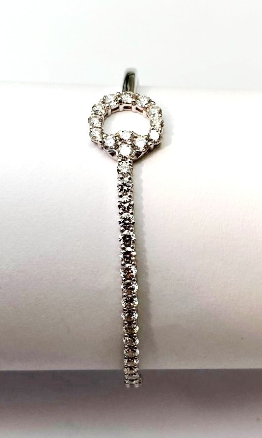 Loading... Please wait...This is a gorgeous signed Vintage Gucci bangle bracelet. This 18kt White Gold piece features a stunning diamond horse-bit with a row of brilliant cut shared prong diamonds across the top. The diamonds range in size from .07-.10 totaling approximately 2.50 carats. They have an approximate GIA color and clarity of G-H/VS1. The bracelet is opens in the back with a safety bar. It is stamped “16 AU 750” “GUCCI Made in Italy. The Inner circumference is 6 inches and weighs 10.5 grams. This is a fabulous piece by a legendary jewelry maker, this wonderful Gucci bracelet would make a fabulous addition to any collection.