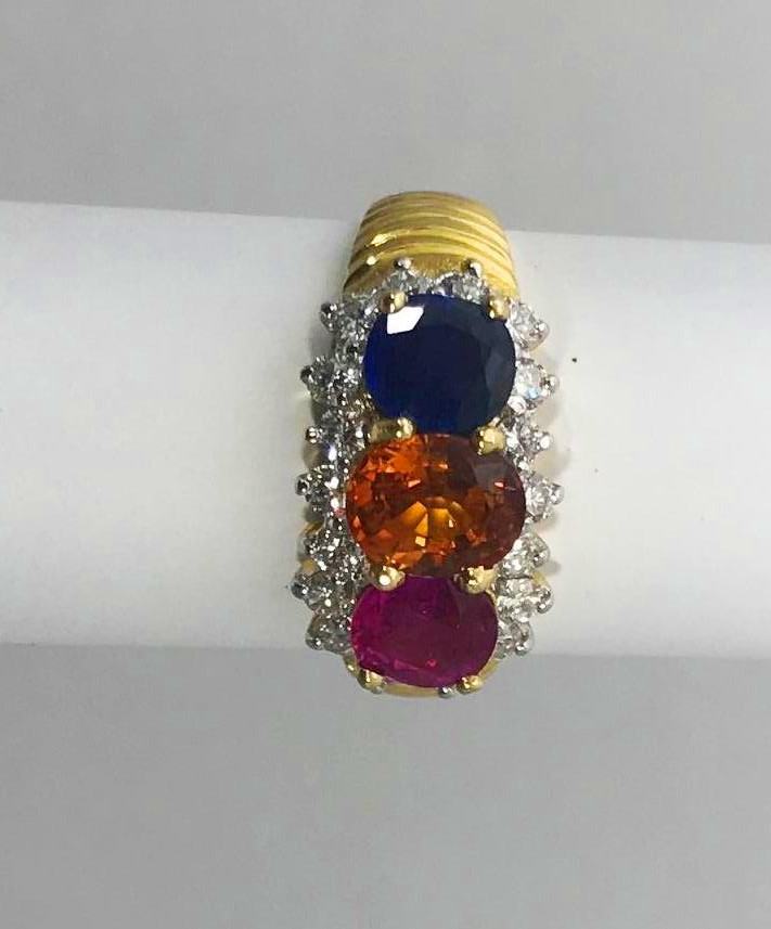 Loading... Please wait...This is a striking sapphire ring from the Modern period. This fantastic ring is made of vibrant 18kt yellow gold and features three beautiful natural corundum stones in the center. A beautiful round red ruby, a fabulous round electric blue sapphire and a gorgeous oval shaped orange sapphire are featured in the center. The center sapphire weighs approximately 1 carat and the ruby and sapphire are each .60 carats each. They are surrounded by a scalloped boarder of round brilliant cut diamonds approximately .05 carts each for a total weight of 1.0 carat. The inside of the band is stamped 750 and tests as 18kt. The center of the ring is 9.5mm and transitions into a scalloped yellow gold band on the shoulders (6mm wide) and tapers to a smooth gold band in the back (3mm). The ring is currently a size 6 and weighs 3 dwt.
